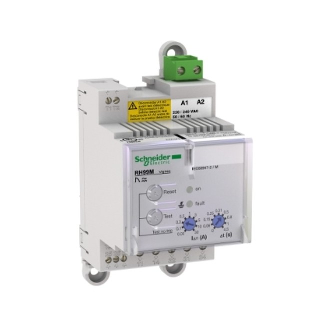 VigiPacT RH99M is a DIN rail mounting residual current protection relay. It protects against people direct or indirect contact, property fire hazards and motors. It measures the earth leakage current in an electrical installation via its associated toroid. It trips the associated circuit breaker when the set residual operation current is overrun. The operational supply voltage is 220/240VAC 50/60Hz. The operational supply voltage is 220/240VAC 50/60Hz. It is a type A earth-leakage protection class. The current sensitivity (IDn) is selectable with 9 thresholds from 30mA to 30A. The time delay (Dt) is selectable with 9 settings from instantaneous to 4.5s. The monitored distribution system voltage is up to 1000 VAC 50/60/400 Hz. It requires a local manual reset after a fault clearance. The monitored distribution system voltage is up to 1000VAC 50/60/400Hz. It is installed on a DIN-rail inside a switchboard and the protection degree is IP40. It must be associated with a compatible Schneider Electric type A toroid or rectangular sensor.
